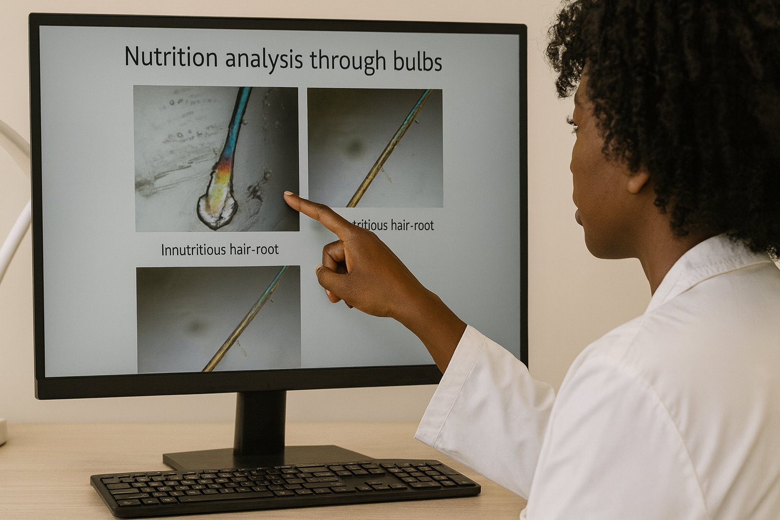 Évaluation trichoscopique : analyse objective du cuir chevelu et de la fibre capillaire afin d’identifier les anomalies (inflammation, pellicules, chute, densité, etc.).